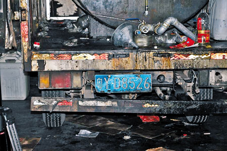 制假現(xiàn)場,一輛改裝車的車廂中,黑乎乎的大油箱內(nèi)裝滿了劣質(zhì)油