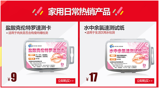 家用日常熱銷產品特價活動。雙十一活動期間二氧化硫38元,奶無憂12元,雙氧水28元,火鍋底料試紙11元,鹽酸克羅特檢測卡9元,水中余氯檢測卡17元,吊白塊檢測試劑77元,大米新生度檢測試劑77元,家用檢測套裝66元,還有更多家用優惠產品等您來拿。