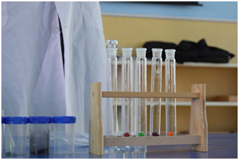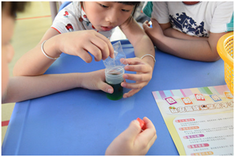 實驗課的開頭,林老師拿出提前準(zhǔn)備好的試管,里面加了兩個神秘的糖豆,讓小朋友在試管中加入水,搖晃幾下,只見水的顏色也從原來的透明變成了糖豆的顏色,小盆友們都瞪大了眼睛并且看的津津有味,還不時露出驚訝的表情。
