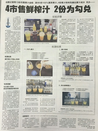 檢測結(jié)果:除1號、12號樣品檢測結(jié)果不符合國家標準外,其他樣品均達到國家標準。1號、12號樣品均為路邊小店購買,北京智云達提醒消費者選購果汁類飲品最好鮮榨的,勾兌的盡量不要購買。