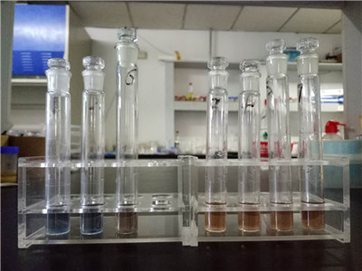 2. 在 10ml 比色管中,加入 4 滴樣品提取液,0.8ml 蒸餾水,1.0ml 試劑 2,2 滴試劑 3,混勻,加 4 滴試劑 4,混勻,再加 4 滴試劑 5,搖勻后,室溫放置 20分鐘。