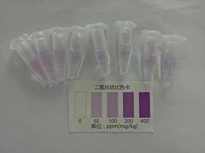 二氧化硫:在1.5ml離心管中先滴加2滴檢測液A,1滴檢測液B,上下搖動,混勻;然后加入1ml樣品液,立即蓋塞混勻。放置5分鐘觀察顏色變化,并與色卡對照,得出樣品中二氧化硫或亞硫酸鹽是否超標的信息。
