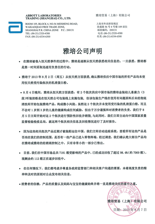雅培方面表示,公司于2013年8月2日(周五)從恒天然方面獲悉,確認雅培供應中國市場的所有產品均未使用恒天然受污染批次的乳清蛋白粉。8月4日晚間,從恒天然方面獲悉:有2個批次供應中國市場的雅培金裝幼兒喜康力(3段)聽裝奶粉是在恒天然公司包裝線上實施包裝, 但該包裝生產線在使用有問題原料后未經徹底清洗即開始包裝雅培產品,構成微小風險。