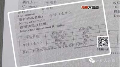 然而,湖南經(jīng)視新聞?wù){(diào)查報(bào)道,這家湖南知名的餐廳送檢的一份兒童牛排(檢測(cè)單位:湖南出入境檢驗(yàn)檢疫局),除了牛源性成分,還檢測(cè)出有鴨成分。