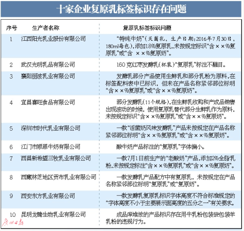 這10家復原乳標簽存在問題的企業(yè)中,有6家使用了復原乳卻完全不做標注;有三家“復原乳”標注顏色色差不明顯、字體高度不符合規(guī)定要求;另外,查處1家企業(yè)違規(guī)使用牛乳粉包裝袋包裝羊乳粉。
