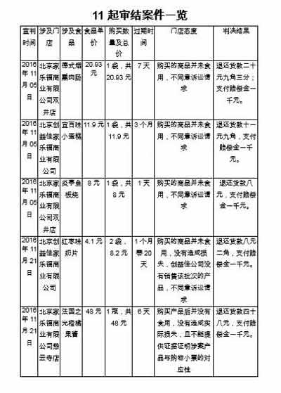 上個月,朝陽法院審結的11起案件,涉及北京家樂福4家店,即雙井店(2起)、創益佳店(2起)、慈云寺店(1起)和四元橋店(6起)。