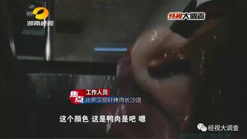 北京漢麗軒烤肉店遍布全國,可是在長沙這家店我們憤怒的看到,店里的所謂牛肉都是用鴨肉偽造,甚至還摻入變質的鴨肉,而且造假用的鴨肉都是統一配送過來的。若不是記者長時間辛苦的臥底調查,誰能知道其中真相!消費者會永遠被蒙蔽,欺詐伎倆會永遠繼續(xù),漢麗軒會繼續(xù)“騙過全世界”。誠信不僅是經商的根本,更是做人的根本,對于這種弄虛作假的所謂全國連鎖,消費者不歡迎!我們期待執(zhí)法部門重拳出擊,而不是為之遮丑掩蓋。