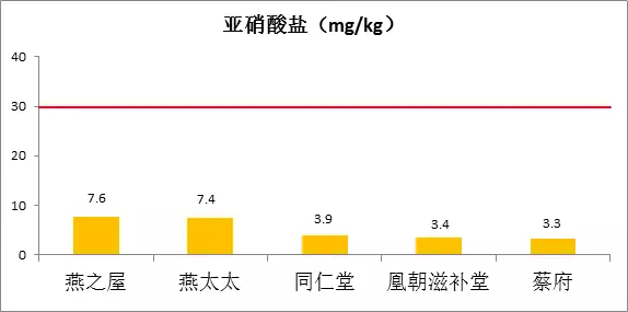 此次檢測結果顯示,五品牌燕窩的亞硝酸鹽含量均低于10mg/kg,符合限量值規定。