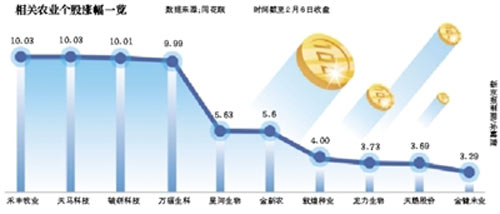 受此影響,2月6日,相關(guān)農(nóng)業(yè)股、期貨等均出現(xiàn)大漲,其中,農(nóng)產(chǎn)品加工、農(nóng)機(jī)等農(nóng)業(yè)股迎來新年首個(gè)紅包,漲幅居前,多只股票漲停。