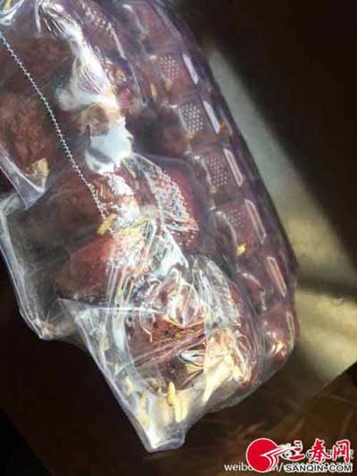 記者從該網(wǎng)友提供的照片看到,消費(fèi)者稱里面有蟲(chóng)子的大棗品牌為“北方谷雨”狗頭棗,系陜西北方谷雨特產(chǎn)食品有限公司生產(chǎn)。透過(guò)透明包裝袋可以清楚的看到,數(shù)條白色的“蛆蟲(chóng)”趴在大棗上。微博網(wǎng)友@淉淉7號(hào)告訴記者,她的同事暫時(shí)還沒(méi)有前去超市交涉,但后面肯定要去。