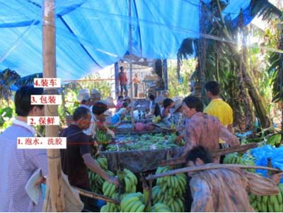 視頻中的香蕉為什么都是青的?王明月說,香蕉要在七八成熟的時候進行采摘。一般都會將香蕉置于冰水或涼水中降溫并洗去蕉油,然后置于含有保鮮劑的水池中浸泡數分鐘進行殺菌保鮮處理,晾干后用塑料袋包裝、抽真空、裝箱,然后馬上裝車運輸至冷庫貯存。