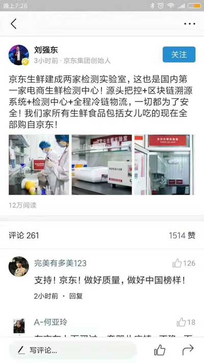 劉強東在個人賬號表示,“京東生鮮建成兩家檢測實驗室,這也是國內第一家電商生鮮檢測中心。源頭把控+區塊鏈溯源系統+檢測中心+全程冷鏈物流,一切都為了安全!”
