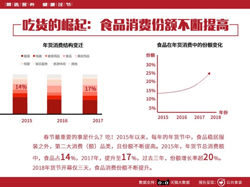 科信食品與營養信息交流中心副主任、食品與營養科學傳播聯盟副秘書長鐘凱表示:“六家專業機構正是基于大數據揭示的食品消費趨勢,制作了‘慧選營養,健康過節’——2018春節食品消費建議,并希望通過天貓等互聯網年貨消費平臺,倡導公眾智慧選購食材,保持膳食均衡,飲食適度適量,并將健康的飲食習慣帶給自己的家人。”