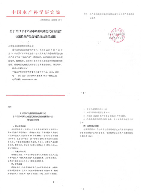 中國水產(chǎn)科學(xué)研究院質(zhì)量與標(biāo)準(zhǔn)研究中心受農(nóng)業(yè)部漁業(yè)漁政管理局委托 ,運用智云達(dá)自主研發(fā)的水產(chǎn)品快檢產(chǎn)品,對水產(chǎn)品中硝基呋喃類代謝物進(jìn)行快速檢測。2017年10月23日-24日,該檢測在國家水產(chǎn)品質(zhì)檢中心順利開展。驗證結(jié)果如下: