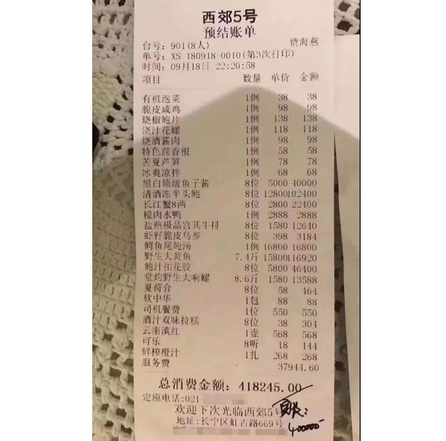 網傳“天價賬單”出自上海一家名為“西郊5號”的飯店,出單臺號為901,用餐人數為8人,賬單顯示,結賬時間為18日晚10時20分,所點菜品共20項,其中包括有機泡菜、蘆筍、涼拌菜等,但絕大部分菜品為螃蟹、花膠、鮑魚等海珍品,另有包括可樂等在內的飲料,以及香煙。