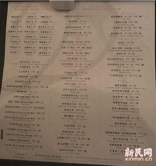 新民晚報新民網記者在店里看到一份菜單,網傳“天價賬單”上“清酒凍半頭鮑”、“黑白頂級魚子醬”等幾個單價較貴的菜品在菜單上均無銷售,菜單上最貴的菜品為“超級一頭鮑”價格為3800元/只。