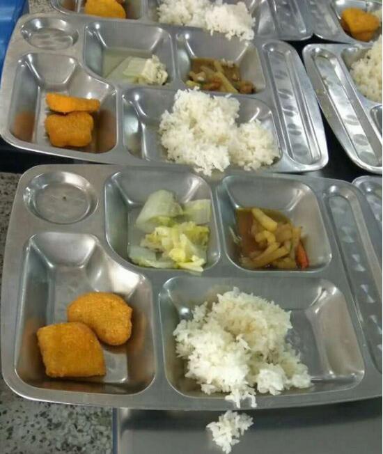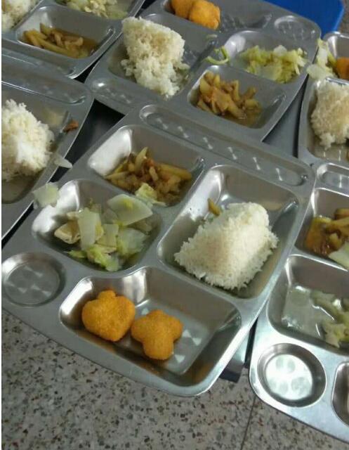 從 10 月 8 日下午開始,照片陸續(xù)出現(xiàn)在微信群和其他自媒體上,并傳播開來。記者從照片上可見,在不銹鋼的餐盤上,除了少量米飯,還有三個(gè)菜,其中能看到土豆、白菜和兩個(gè)黃色的油炸小餅,與普通成人的飯量相比,份量均顯得明顯不足。