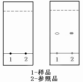 取一片硅膠板,在白色涂層面底端向上約1厘米處,用鉛筆畫一條直線,取兩點(diǎn)分別作為樣品和參照品的點(diǎn)樣點(diǎn)(如圖所示)。取1支毛細(xì)管,將其下端浸入樣品上清液中,停留2秒后取出,與樣品點(diǎn)樣點(diǎn)垂直接觸。點(diǎn)樣斑點(diǎn)揮干后,再重復(fù)點(diǎn)樣一次(斑點(diǎn)直徑控制在5毫米以內(nèi))。另取毛細(xì)管取參照品溶液在參照品點(diǎn)樣處進(jìn)行點(diǎn)樣,晾干后備用。