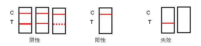 無效反應:C線不顯色,無論T線是否顯色,該檢測卡均判為無效。未出現(xiàn)C線,表明操作過程不正確或檢測卡已變質(zhì)失效。在此情況下,應再次仔細閱讀說明書,并用新的檢測卡重新測試。