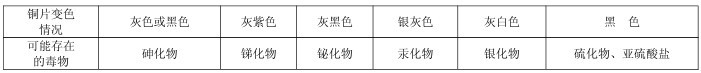 瓶放在電熱板上,調節溫控旋鈕使樣液微沸約 10 分鐘(驅除硫化物的干擾),此時加入 2 片銅片,保持微沸約 20 分鐘。注意隨時補加熱水,保持體積不變。若加熱 30 分鐘后銅片表面未變色,可否定砷、汞的存在,如銅片變色,可按下表推測樣品中可能存在的化合物,并可采取相應措施加以處理。保留陽性樣品,有條件時分別加以確證。