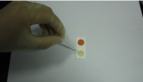 2、 取出農藥殘留快速檢測卡,用滴管吸取2-3滴提取液,將提取液液滴加入到農殘卡白色要片上。