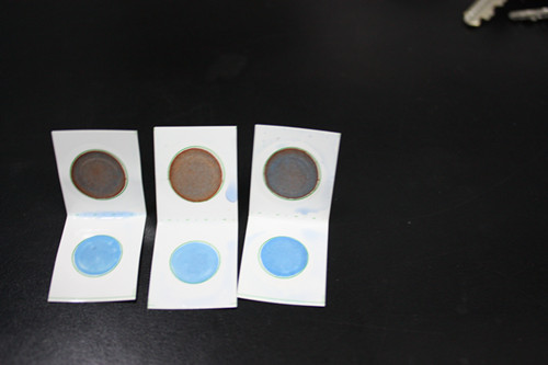 打開后的農殘卡卡片白色藥片初變為天藍色。
