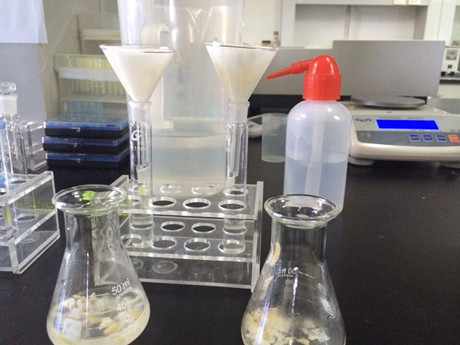 2、 加蒸餾水19mL,A溶液1mL,充分搖動(dòng),超聲5分鐘,靜置5分鐘,過濾,濾液備用。
