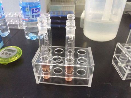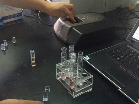 3、 樣品管:分別取0.4mL樣品液于10mL比色管中,做平行測(cè)試,分別加B溶液1mL、C溶液0.2mL,混勻,加D溶液0.4mL,搖勻,再加E溶液0.4mL,立即用蒸餾水稀釋至5mL刻線,搖勻,靜置20min,進(jìn)行檢測(cè)。空白管:不加E溶液,其余步驟與樣品管同。