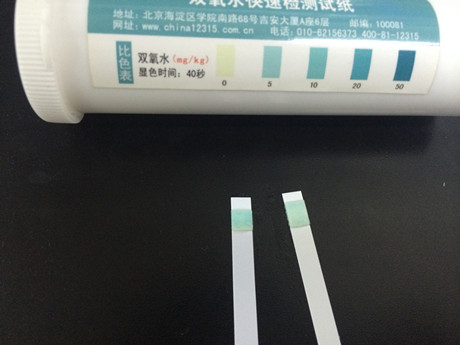 5、由于儀器的雙氧水檢出限為10mg/kg,決定用雙氧水試紙再驗證一下。檢測結(jié)果:雙氧水含量在0-5mg/kg之間。
