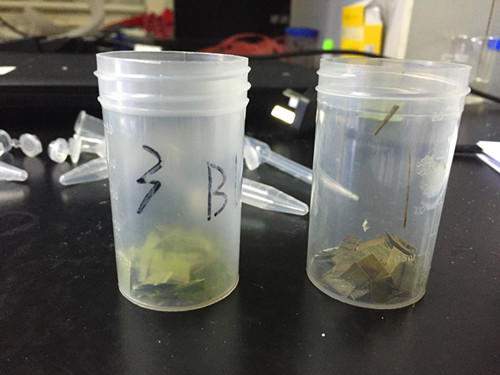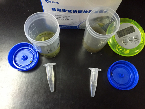 首先我們將文先生寄送過(guò)來(lái)的兩種粽葉都進(jìn)行剪碎取樣,稱取 0.8g 樣品于提取瓶中,加蒸餾水或純凈水 20mL,蓋上蓋振搖 1 分鐘,放置 10min,期間可振搖加快提取,其上清液為樣品液。