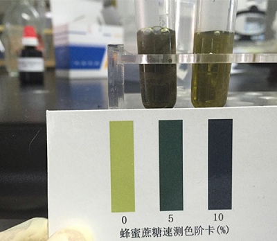 把離心管放入沸水浴中加熱5分鐘,取出與比色卡比對,讀出樣品中蔗糖的含量(%)。根據國家標準規定,桉樹蜂蜜、柑橘蜂蜜、紫苜蓿蜂蜜、荔枝蜂蜜、野桂花蜜中蔗糖應≤10 g/100 g,其他蜂蜜應≤5 g/100 g。結果顯示樣品中蔗糖含量符合國家標準。